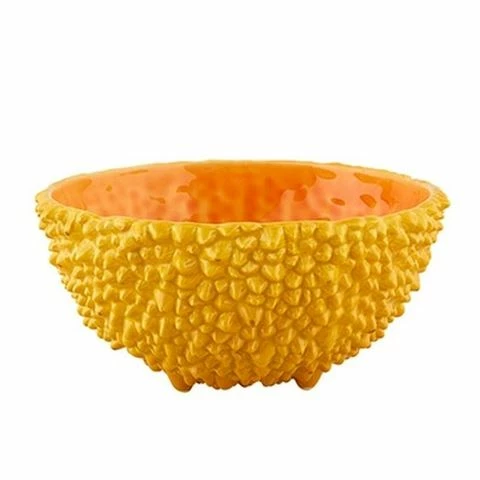 This award winning bowl is crafted from earthenware with a glazed tangerine interior and a bright yellow spiky exterior, which looks a little like a beehive. It rests on tiny, white plugs to protect surfaces.