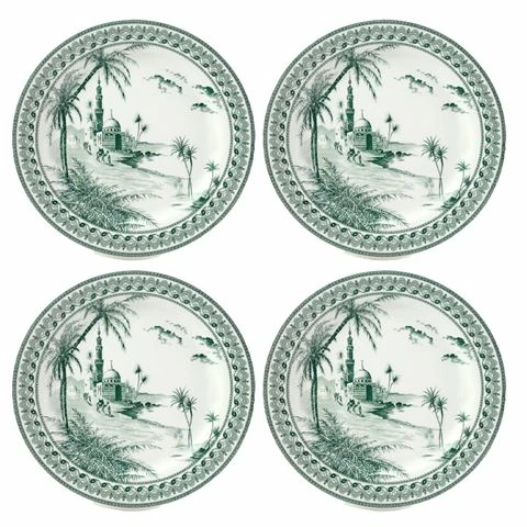 Gienâs Les DĂ©pareillĂ©es Vue dâOrient collection features a sublime Oriental landscape with a domed building and a tower, framed by palm trees. Itâs an award-winning vintage pattern, which first surfaced in the 1870s and reflects the classic trend towards the Orient at that time. Itâs the perfect plate to dine out on.